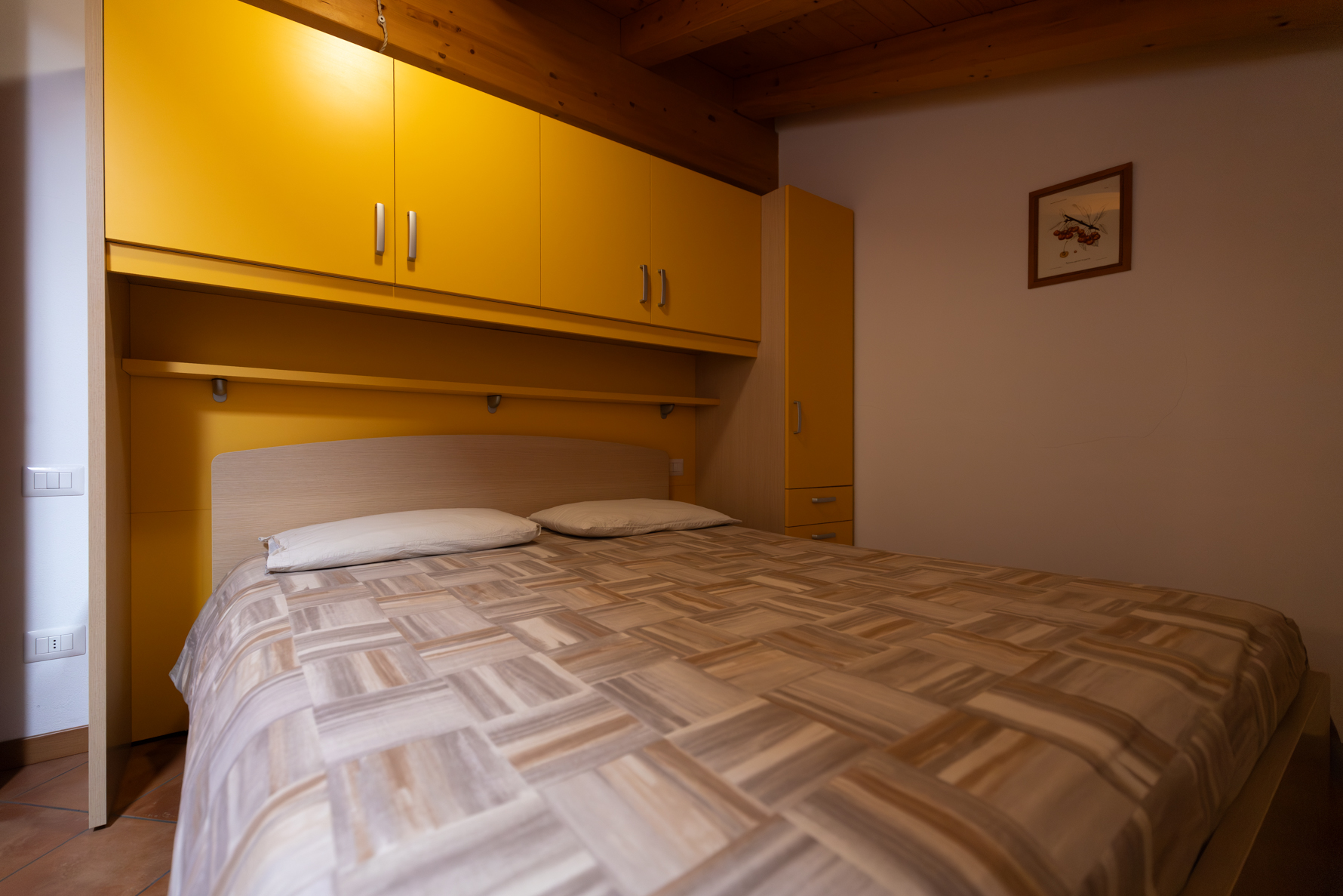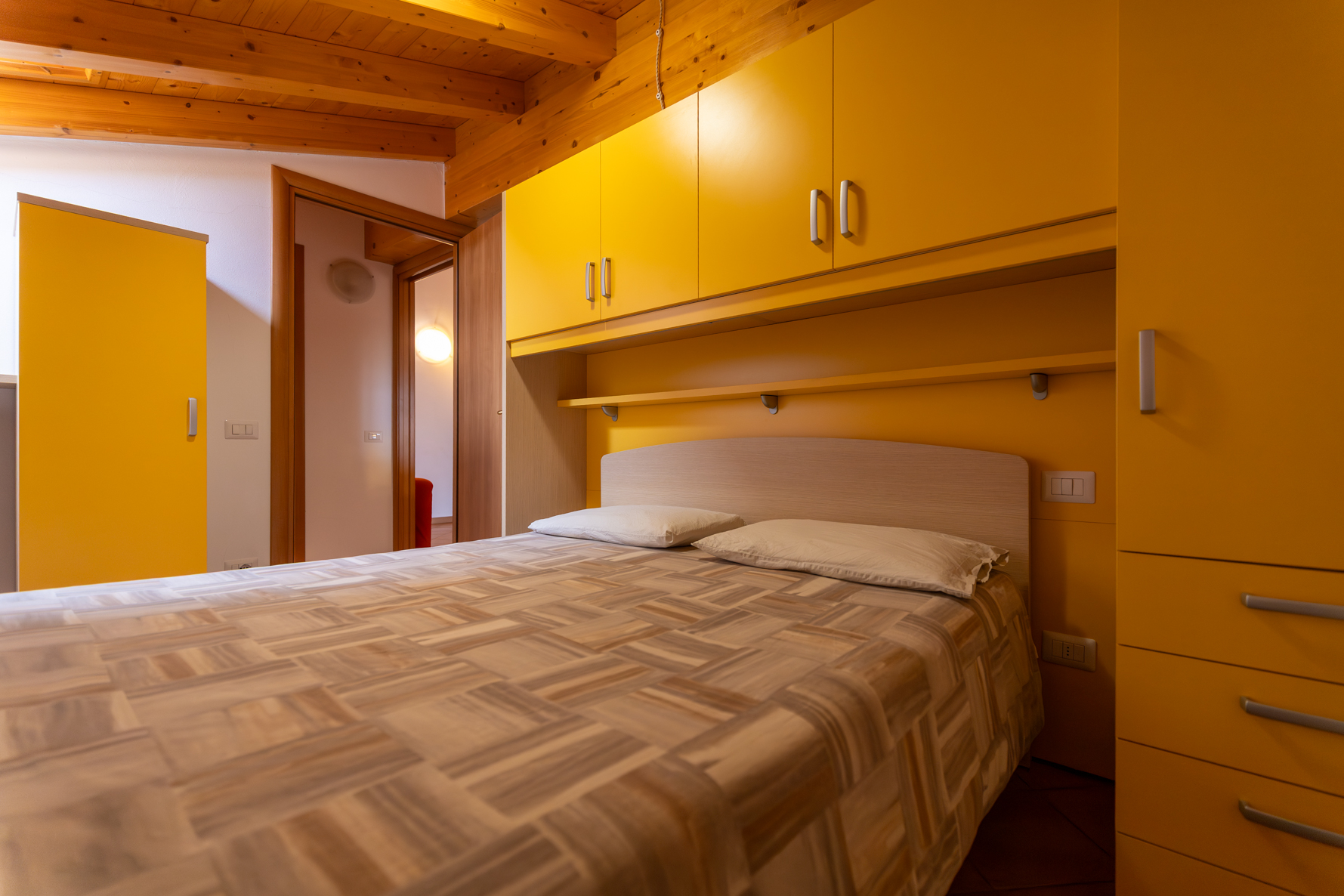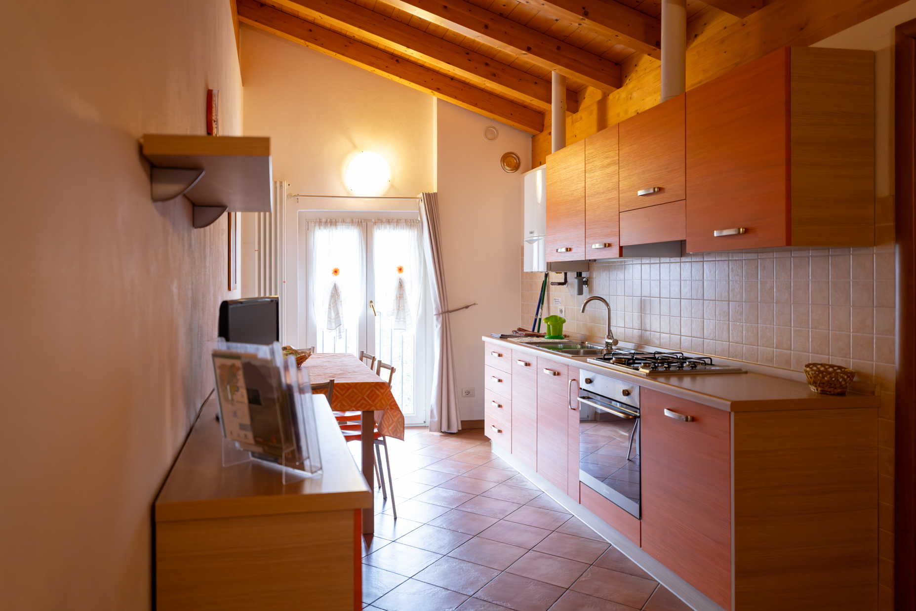 L’appartamento è reso caldo e accogliente dall’ottima scelta dei materiali e dal soffitto con travi a vista in legno lamellare.