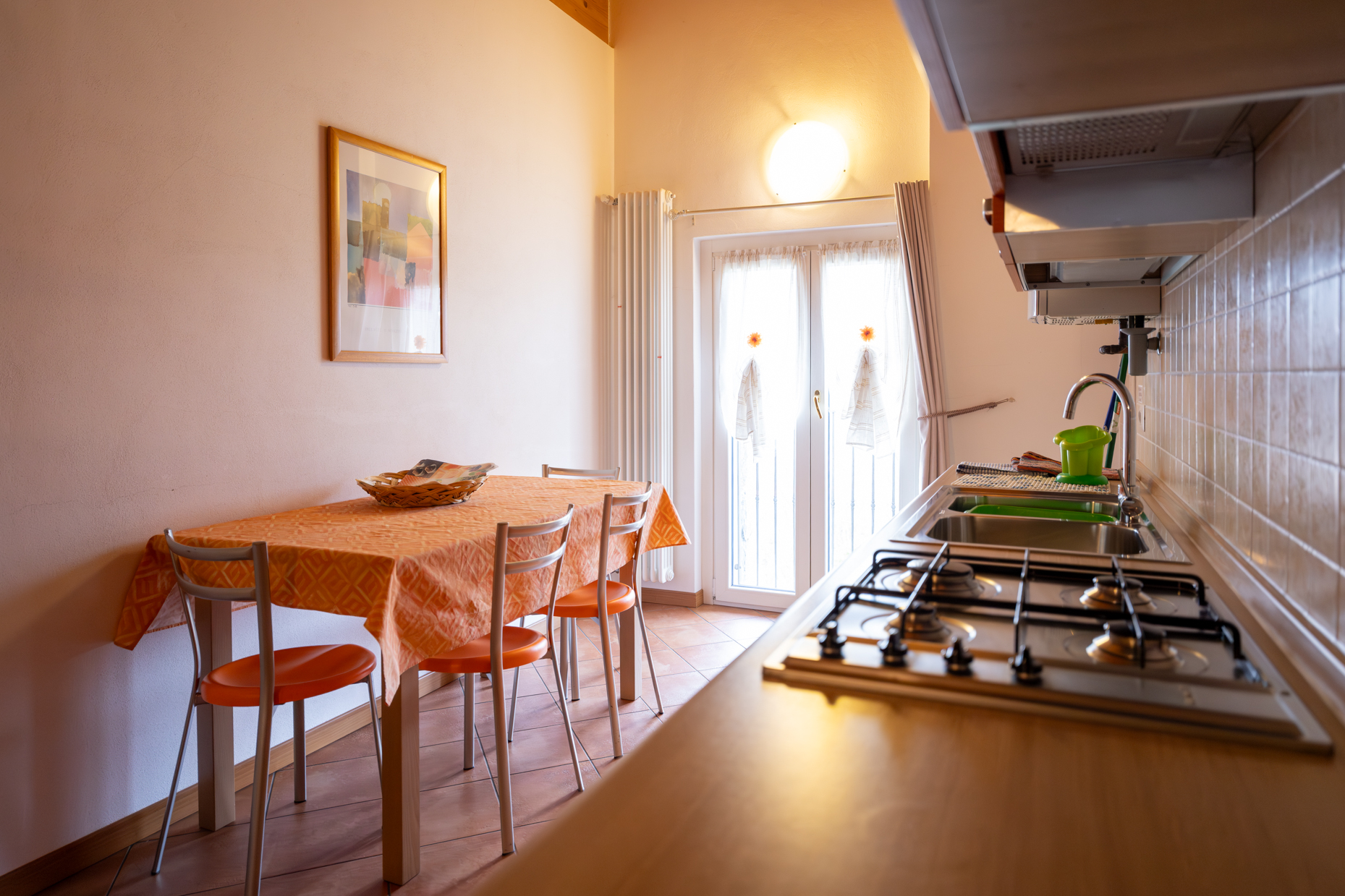 La zona giorno, composta da un unico spazio aperto, comprende il soggiorno con TV e divano letto matrimoniale e la cucina fornita di tutto il necessario per cucinare.